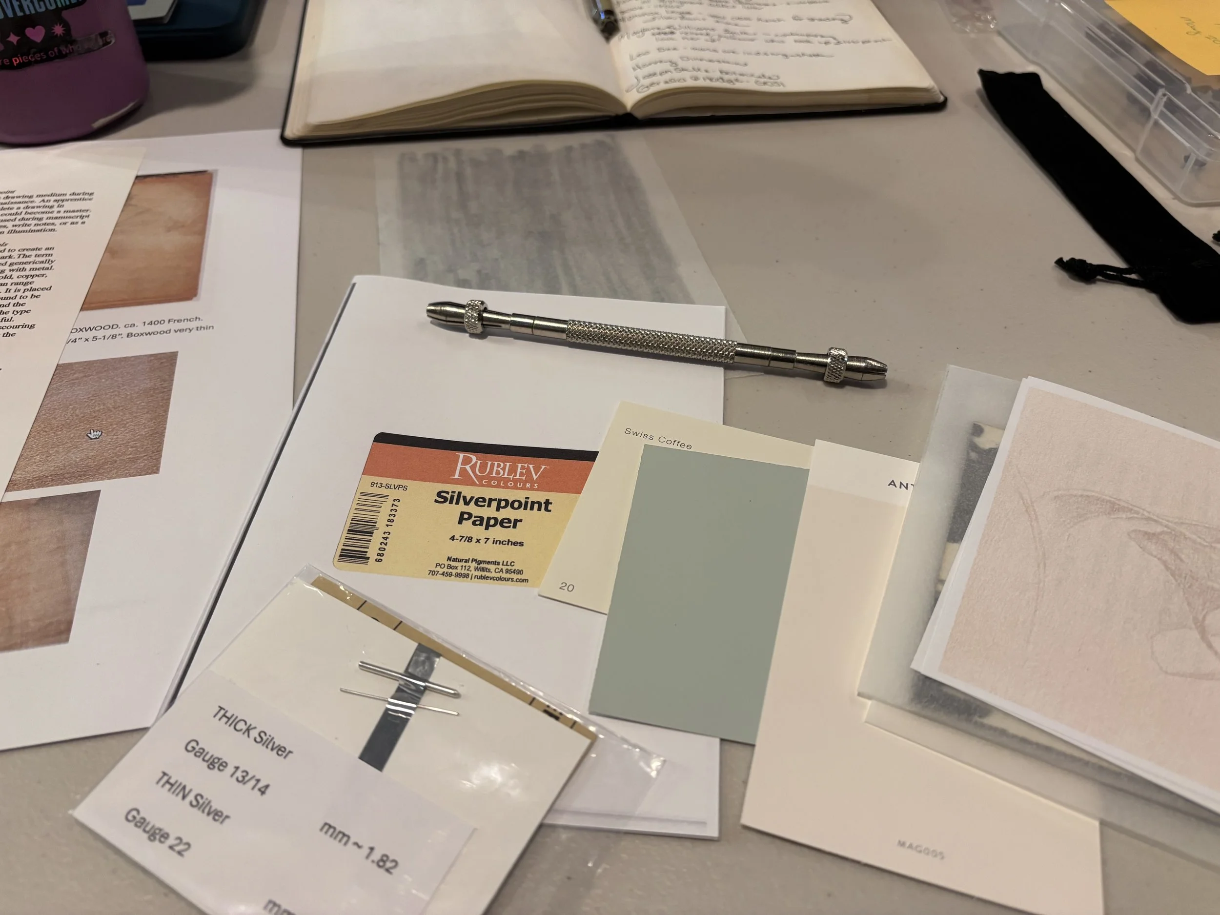 Members of the workshop were given what many of us referred to as “our goodie bag” that Carol-Jean lovingly created to get us just what we needed to get started with this medium. This included: a fine piece of silver and a medium piece of silver, three pieces of prepared surfaces, a small piece of sandpaper to sharpen our points, as well as some hardware store paintchips- which were perfectly sized papers to test our materials on! She also created a handy bookmark that has important facts and tips about silverpoint, and a small print of one of her pieces. The only thing we needed to supply was a lead holder or silverpoint holder.