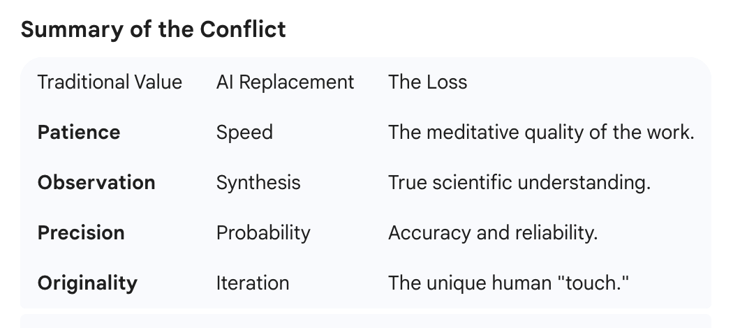Loss of Intent: Every brushstroke in a traditional piece is a decision. AI-assisted art replaces thousands of micro-decisions with a single prompt, which some argue strips the work of its soul and the artist’s unique "voice."
